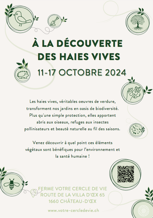 Découverte des haies vives et de leurs valeurs écologiques, culinaires et médicinales de 10h à 16h à la ferme Votre Cercle de Vie à Château-d'Oex, en partenariat avec le Parc naturel régional Gruyère Pays-d’Enhaut Parcours didactique le Sentier de la Transition consacré aux enjeux écologiques et sociétaux explorés à travers 15 thématiques et faisant le lien avec le projet Votre Cercle de Vie -